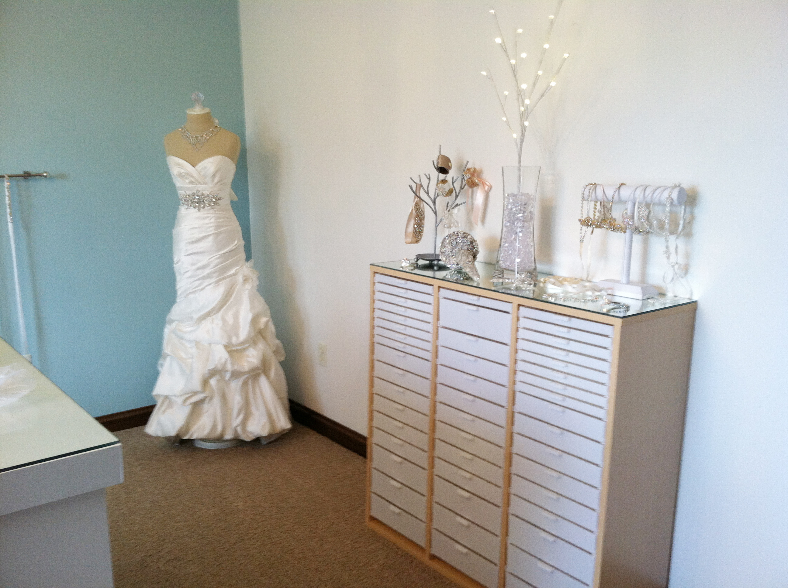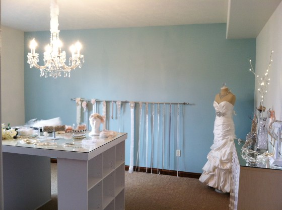 We are very excited to share our completed Design Studio with you. Many hours of hard work have paid off, and we couldn’t be more thrilled with out it turned out. Brides are now able to shop, try on accessories, and envison their look on an actual wedding gown, all in the design studio. We are now busy designing and creating accessories for the 2012 season.