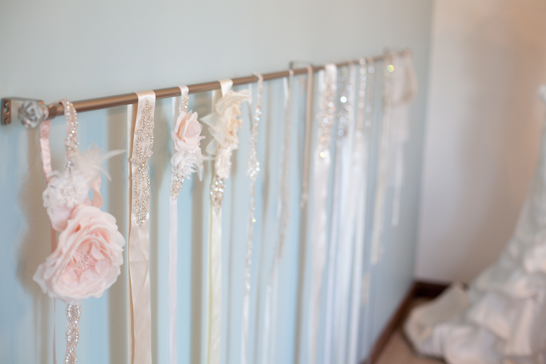 Looking for a cute and practical way to hang or display your wedding sashes? I use a crystal tip curtain rod! Just mount it to the wall, and hang your sashes. Such a great way to display wedding accessories that look best hung up. This idea could be used for displaying products for vendors, bridal boutiques, or even Brides looking to display her sashes and jewelry. Also a great place to hang your scarves or belts in your bedroom or closet!
